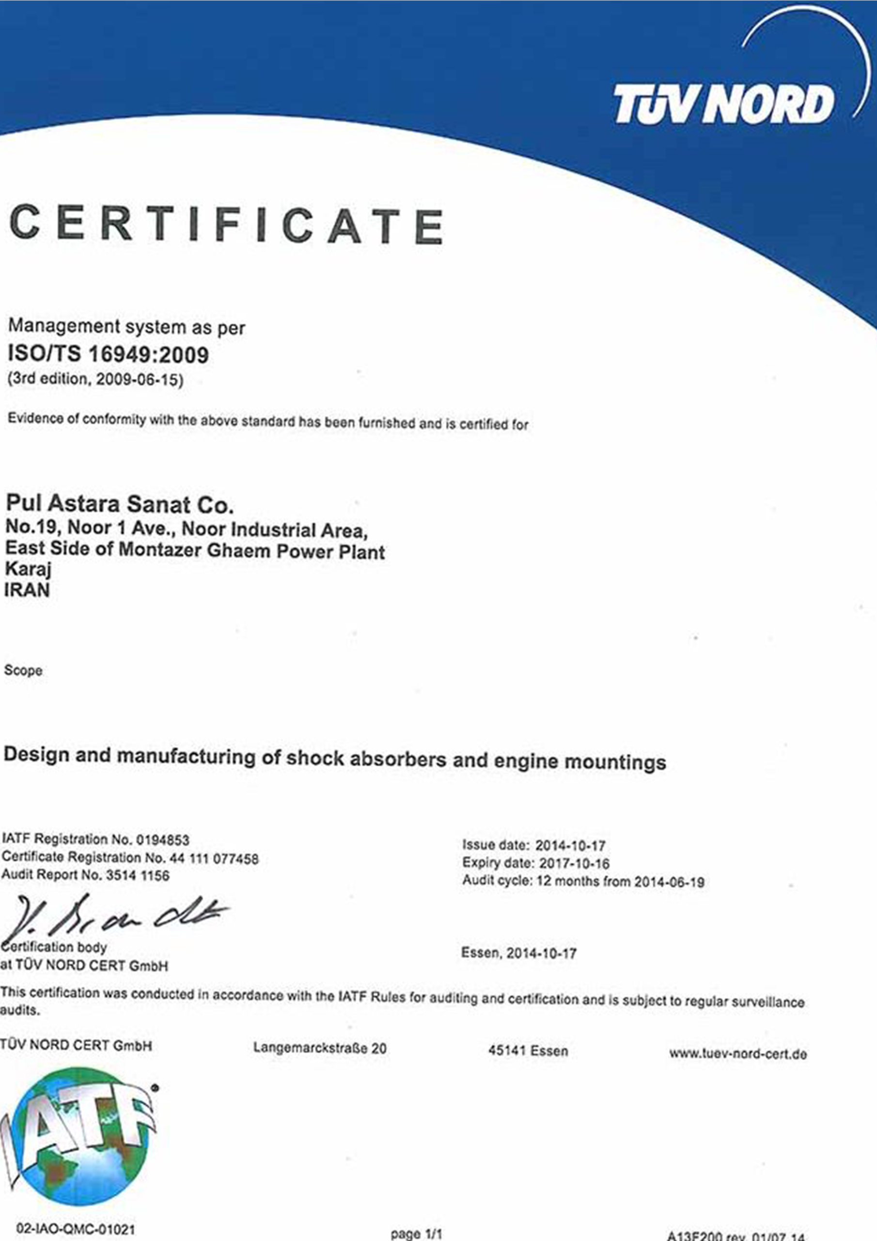 - اخذ استاندارد ISO\TS 16949:2009 از شرکت NORD TÜV آلمان