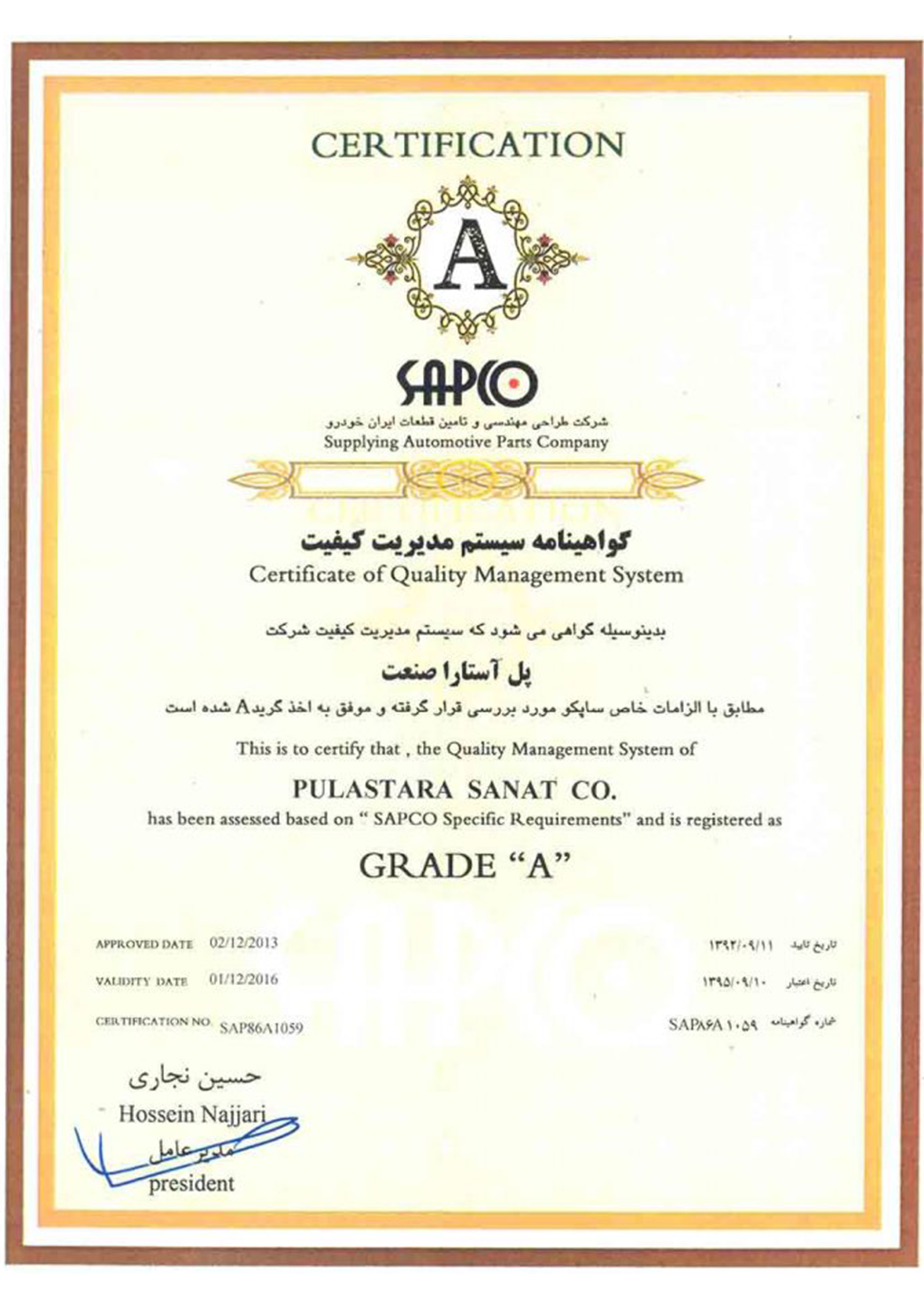 - اخذ گريد A شرکت ساپکو در زمينه طراحی و توليد محصولات